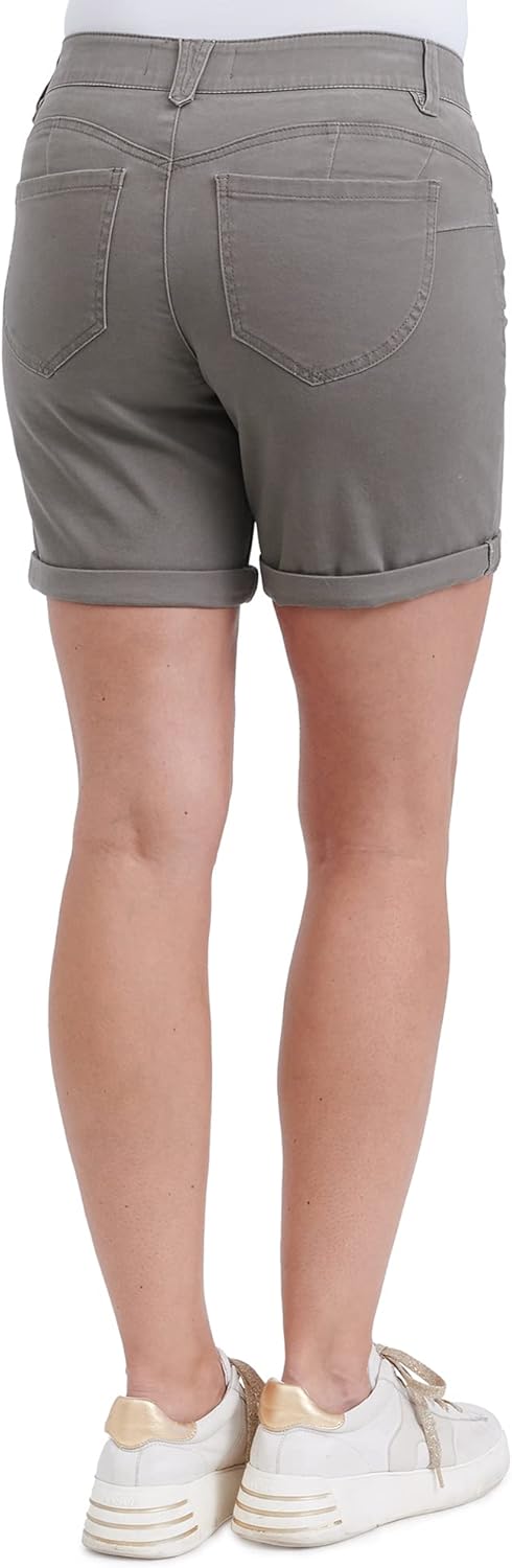 Flatter your figure with these stretchy petite "Ab"solution shorts crafted with an extra booty-lift fit. Designed with a hidden no-gap elastic waistband that prevents unwanted gapping and interior tummy-smoothing power mesh panels. Style# BP471VMX2 Fit# 471 The "Ab"solution shorts are fitted through the hips with a relaxed leg opening. Mid-rise approx. 9.5" Inseam cuffed approx 6" Inseam uncuffed approx. 8" Leg opening approx. 21" Fits true to size. 53% cotton, 29% polyester, 15% rayon, 3% spandex Machine wash cold inside out with like colors, gentle cycle. Use only non-chlorine bleach when needed, tumble dry low. Iron on lowest setting on reverse side only.