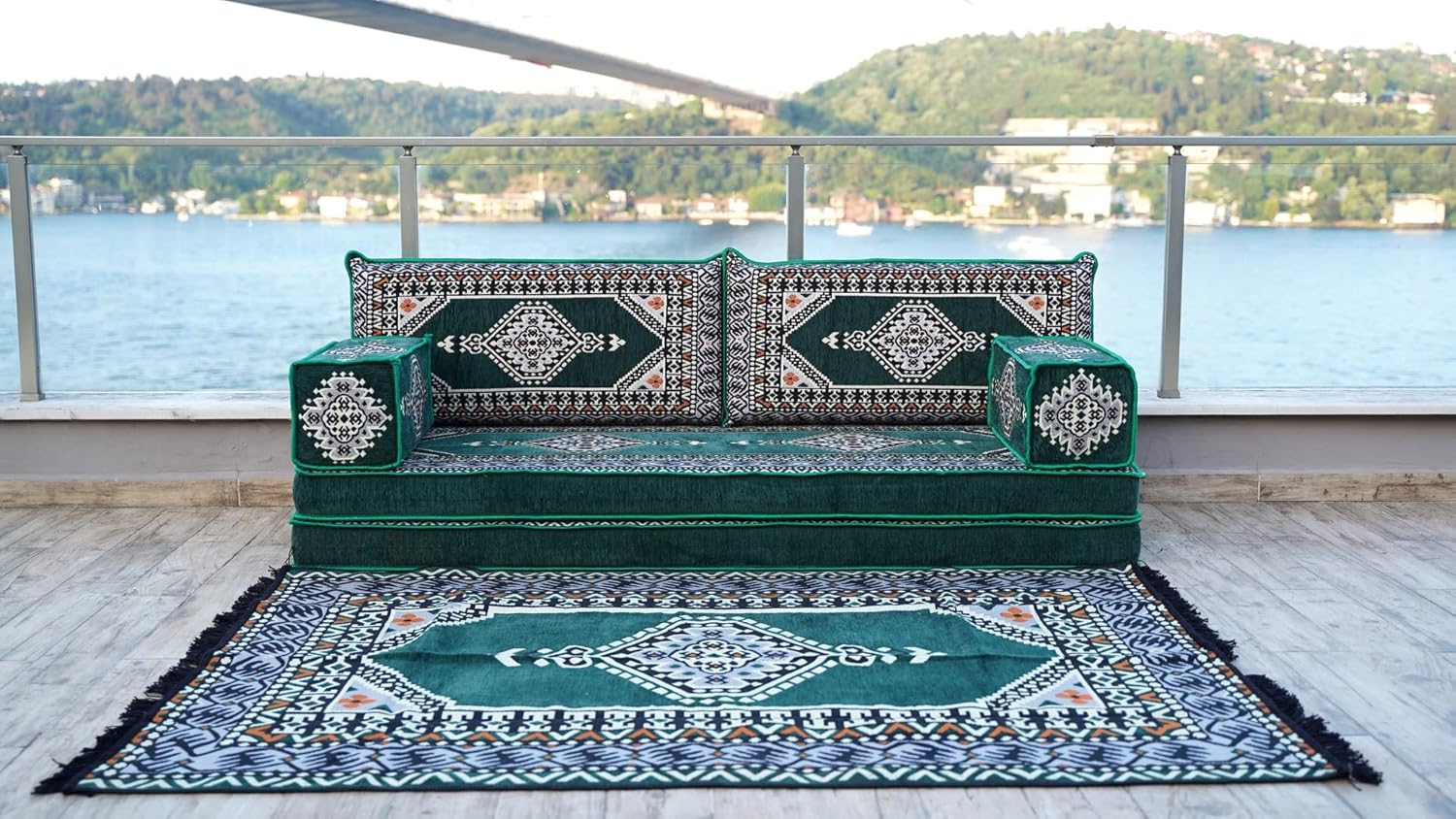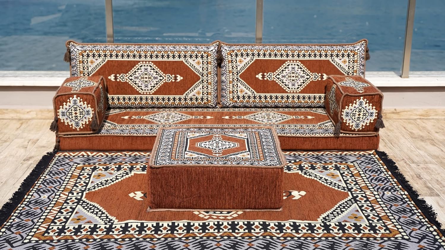You will receive products in the variant you selected from the listing page. This sofa set comes in 10 separate pieces. If you choose 'Sofa Full Set / 4'' Thickness' you will get these: -1 Floor Seating Cushion (190 x 70 x 10 cm / 75 x 27 x 4 inch) -2 Backrest Pillows (90 x 40 x 10 cm / 35 x 16 x 4 inch) -2 Armrest Pillows (50 x 20 x 20 cm / 20 x 8 x 8 inch) -1 Matching Rug (120cm x 180cm / 47 x 71 inch) -1 Ottoman Couch (60 x 60 x 20 cm / 23 x 23 x 8 inch) -3 Pouff Pillows (70 x 50 / 27 x 20 inch) * The floor sofas are not freestanding, they need to lean against a wall or something hard behind * We can customize this product upon your request * All covers include their foam filling inserts * All covers are zippered * Beautiful texture and soft to touch * Comfortable to sit or sleep on * Top-quality finish and workmanship * Excellent for homes, offices, hotels, cafeterias, etc. * Machine washable