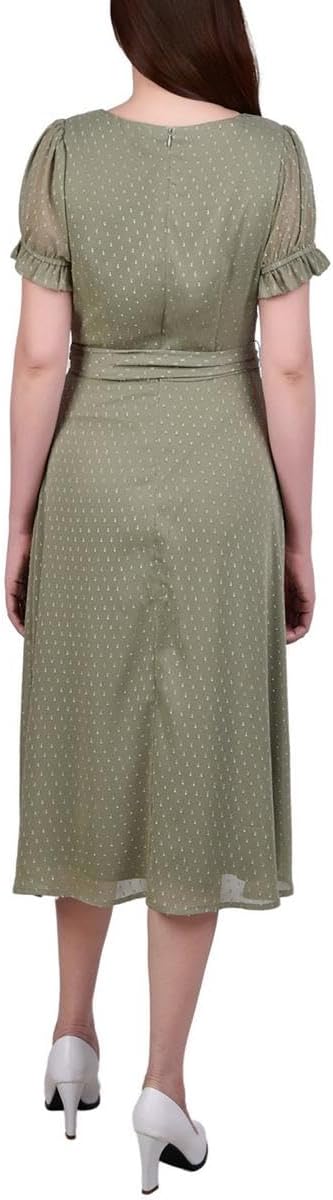 NY Collection introduces this charming Swiss dot dress, featuring a tie waist and rouched sleeves, ideal for special occasions. Ruffle Hem Short Sleeves Pleated Scoop Neck Self-Tie Belt Lined Textured Swiss Dot Fabric 100% Polyester Body, 100% Polyester Lining Machine Washable Approx. 42.5 inches Long Made In Vietnam