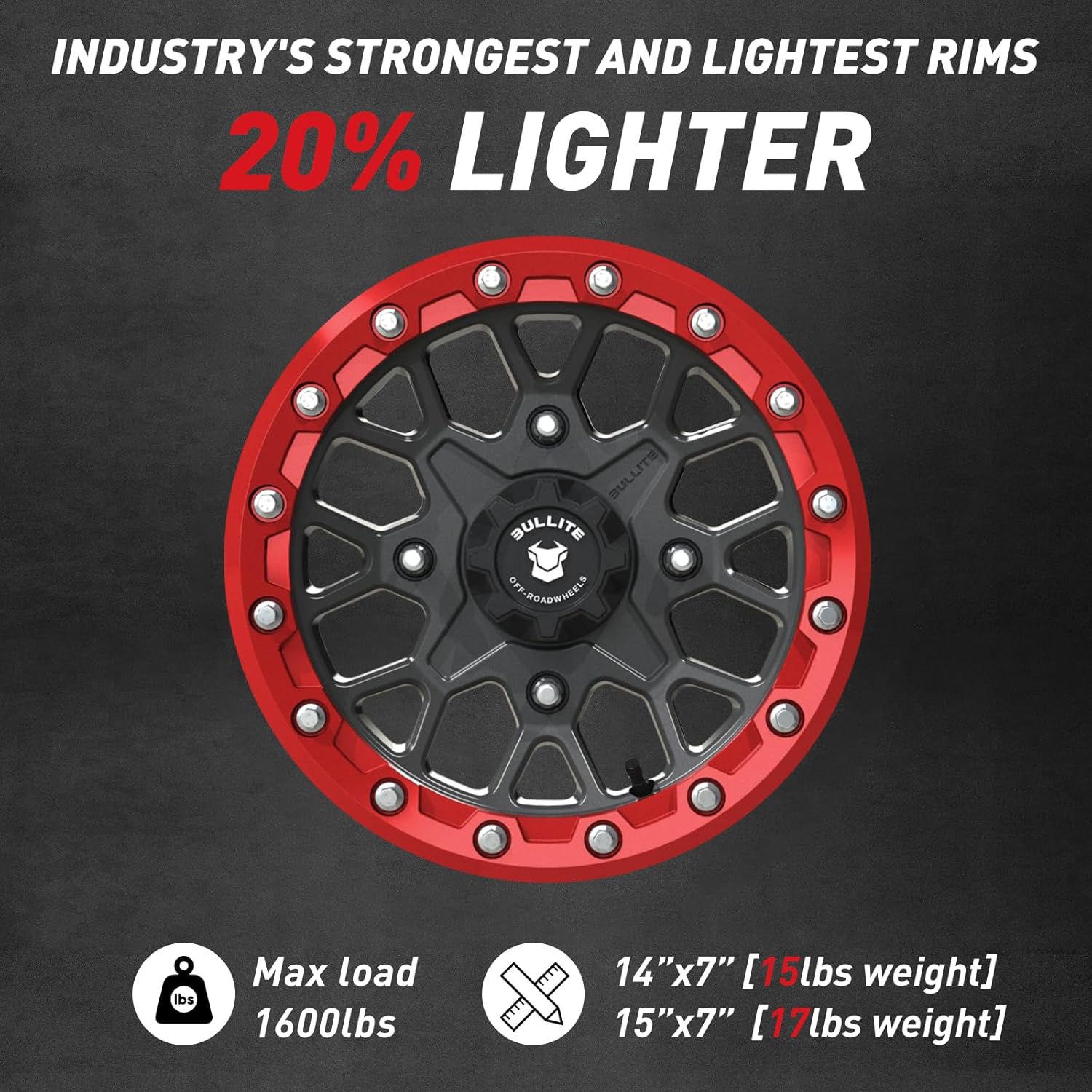 BT-05 RIDER – REIMAGINED FOR 4x110 Engineered for riders who demand precision, the BT-05 RIDER is now available in 4x110 bolt pattern with a 4+3 offset (15mm)—unlocking compatibility for machines including Honda, CF Moto, Segway, and more that utilize 14" or 15" rims in a 4x110 setup. The BT-05 RIDER delivers the same signature performance and styling, now tailored for even more platforms. This is more than a new size—it’s an evolved wheel with breakthrough features: ✅ NEW RIB TECH (Reinforced Inner Barrel Technology) – Our proprietary barrel ribbing technique adds critical structure and durability to the rim. Think of it like the ribbed walls of a soda can—only this is high-grade aluminum. The result? 30% added barrel strength without extra weight, giving you the confidence to ride harder and longer. ✅ NEW BOLT-ON CENTER CAP – Say goodbye to snap-on caps that can loosen on tough terrain. This updated version features a bolt-on center cap for enhanced security and long-term reliability. ✅ REDESIGNED LOOK, SAME ATTITUDE – Our most popular 16-spoke wheel just got sharper. Subtle refinements in the spoke profile elevate its already aggressive style, making it an instant classic in the making. PERFORMANCE-DRIVEN FEATURES: RIB-Reinforced Roll-Formed 5454-H Aluminum Rim Engineered for lightweight strength with added rigidity where it counts. Forged 6061-T6 Beadlock Ring Tempered, ultra-durable, and now available in multiple colors—including our signature Bullite Red. Low-Pressure Casted A356-T6 Disc Optimized for strength without compromise. Grade 8 Beadlock Hardware Kit Trail-proven reliability on every ride. Friction Stir Welding Aerospace-level bonding with zero heat-affected zones—ensuring stronger, cleaner welds. Load Rating: 1600 lbs | Weight: 15–17 lbs High performance without the bulk. SPECIFICATIONS: Size: 14x7 / 15x7 Bolt Pattern: 4x110 / 4x137 / 4x156 Offset: 4+3 (15mm) / 5+2 Colors Available: Gunmetal Gray + Bullite Red / Satin Black / Sapphire Blue / Gunmetal Gray / Aerospace Orange / Raw Machined (Note: Raw Beadlock rings are not clear-coated. Clear-coating is recommended to prevent corrosion.) The Bullite BT-05 Rider isn’t just a wheel—it’s your next performance upgrade. Built stronger, engineered smarter, now compatible with more machines than ever.