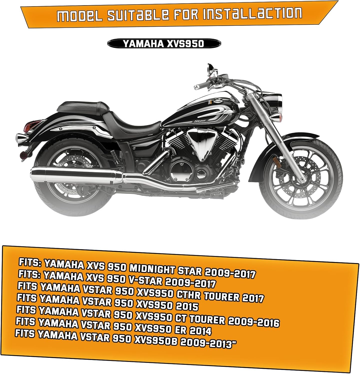 Fits: for Yamaha XVS 950 Midnight Star 2009-2017Fits: for Yamaha XVS 950 V-Star 2009-2017 2017 for Yamaha VStar 950 XVS95 CTHR Tourer2016 for Yamaha VStar 950 XVS950 CT Tourer2015 for Yamaha VStar 950 XVS9502015 for Yamaha VStar 950 XVS950 CT Tourer2014 for Yamaha VStar 950 XVS950 CT Tourer2014 for Yamaha VStar 950 XVS950 ER2013 for Yamaha VStar 950 XVS950B2013 for Yamaha VStar 950 XVS950 CT Tourer2012 for Yamaha VStar 950 XVS950B2012 for Yamaha VStar 950 XVS950 CT Tourer2011 for Yamaha V tar 950 XVS950B2011 for Yamaha VStar 950 XVS950 CT Tourer2010 for Yamaha VStar 950 XVS950B2010 for Yamaha VStar 950 XVS950 CT Tourer2009 for Yamaha VStar 950 XVS950B2009 for Yamaha VStar 950 XVS950 CT Tourer