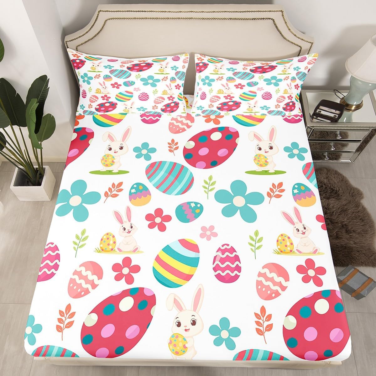 Easter Eggs Decor Kawaii Bed Sheets Full,Rainbow Easter Egg Bedding Sets Multicolor Boho Floral Fitted Sheet,Watercolor Flowers Cute Room Decor Easter Decorations for The Home
