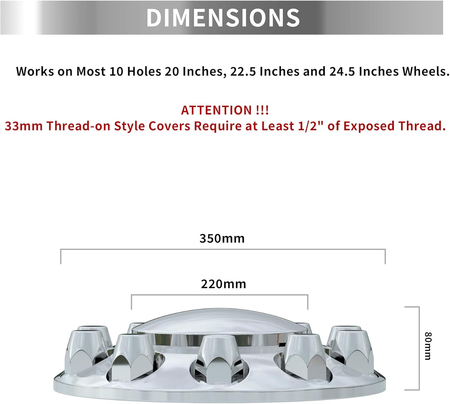 • COMPATIBILITY : Fits Most 10 Holes 20 Inches, 22.5 Inches and 24.5 Inches Wheels with 11.25 Inches Bolt Circle. Attention !!! 33mm Thread-on Style Covers Require at Least 1/2" of Exposed Thread. Please measure and check the size of your truck wheel axle before purchasing