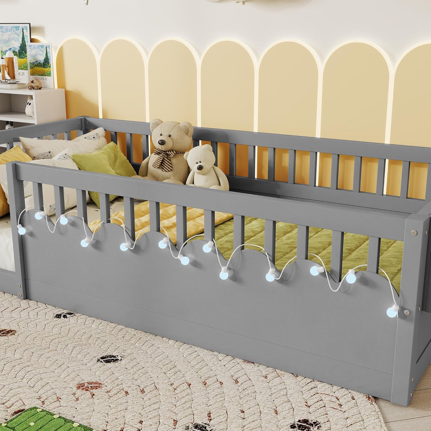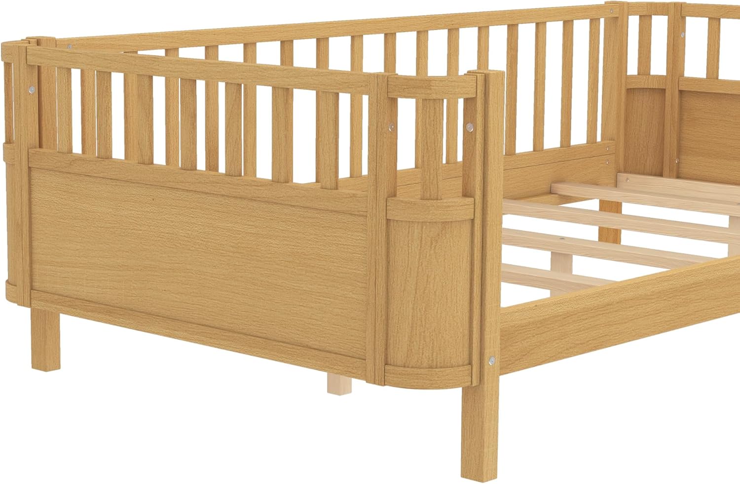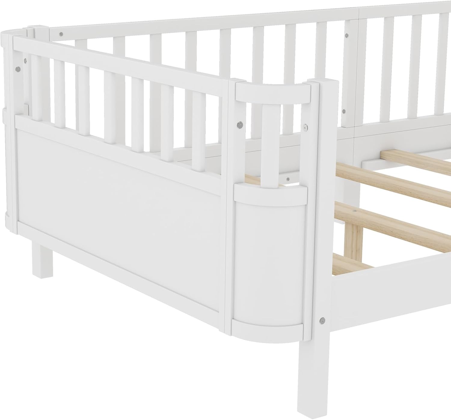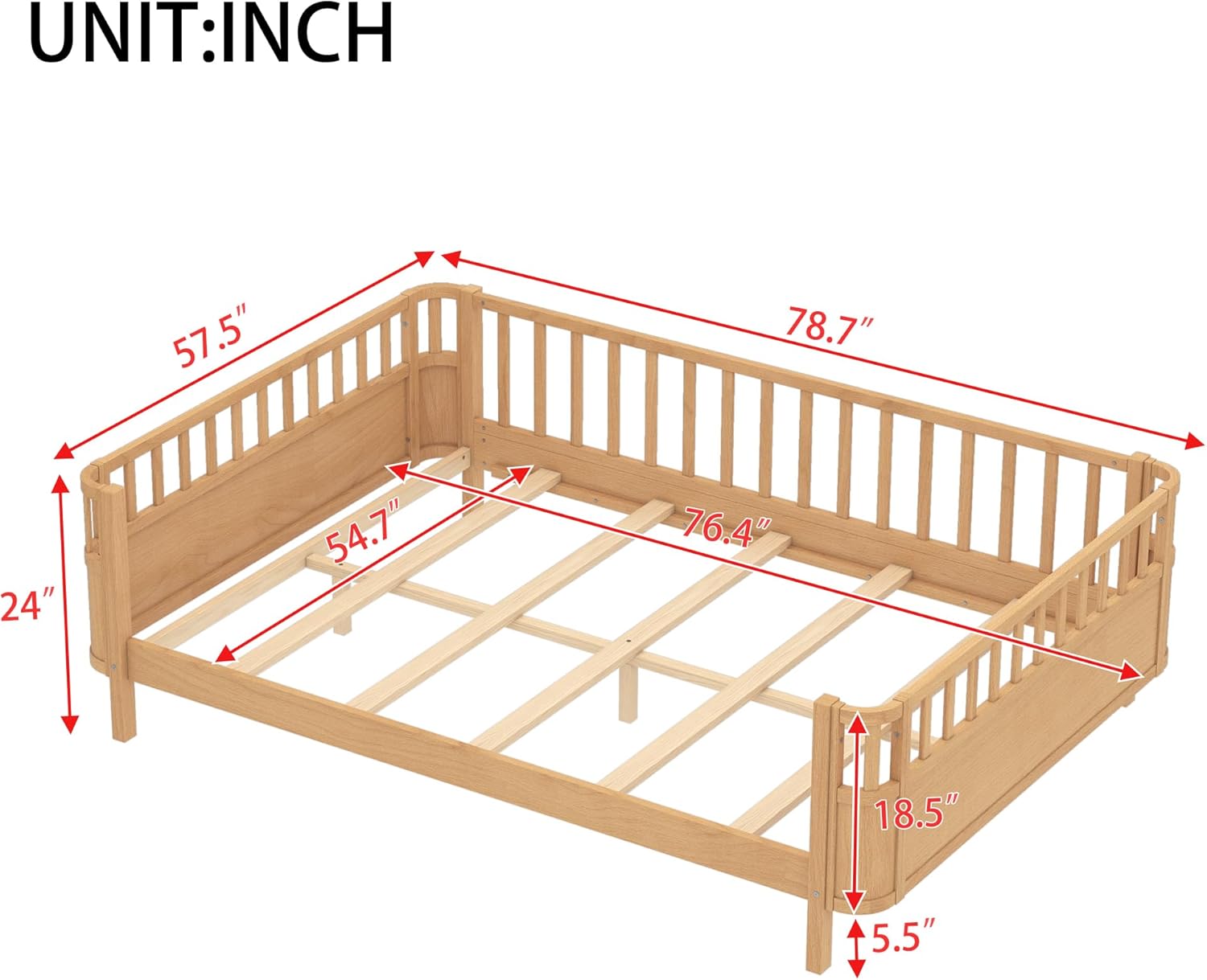 ❤ This kids bed design with the guardrail provides safe guarantee. Constructed of solid pine wood+MDF, features a sturdy high quality solid wood construction for durability and high load capacity, ensuring longevity.◾ Description & Dimensions:Product Type: Platform BedSize: FullColor: White/NaturalOverall Product Dimension: 77.4''L x 56.7''W x 24.2''HProduct Weight: 61.73 LBSWeight Capacity: 350 LBSRecommended Mattress Thickness: 6-8 inchNumber of Slats: 9pcsNumbers of Package: 1Box Spring Required: NoCountry of Origin: Vietnam◾ Notes:1. Manual measurement has been used,there may be some reasonable error.2. All the pictures are taken by actual samples, slight chromatic aberration may occur due to lighting or display.