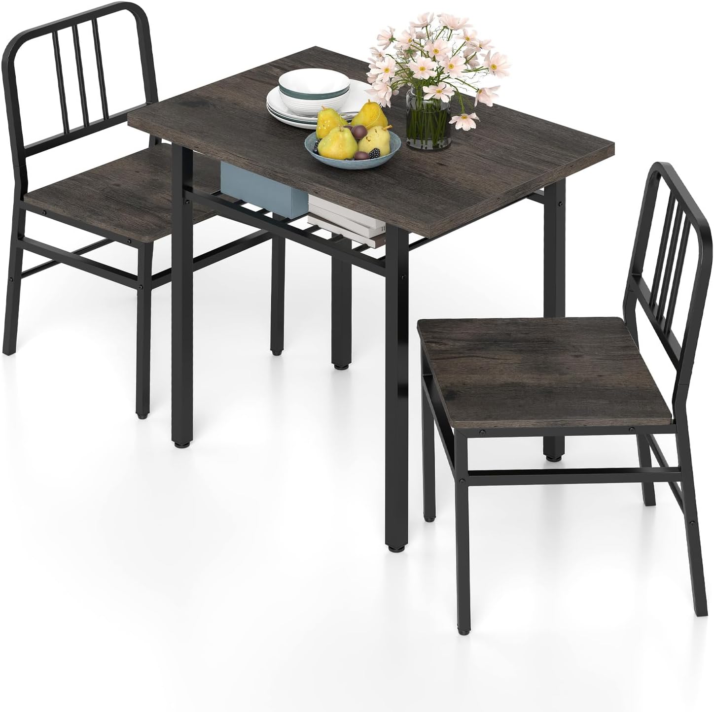 Description:Aesthetically pleasing and compact dining table set for 2 people.The kitchen chairs feature perfect tilt angle, ensuring a cozy dining experience. Plus, the dining table set is designed with a built-in storage rack underneath the table, which allows you to neatly organize your dining essentials and keep them within easy reach. Additionally, the chairs can be neatly tucked away under the table after the meal, making it ideal for smaller dining areas or cozy spaces. Crafted with a sturdy metal frame, both the dinner table and chairs offer unrivaled strength and stability. Plus, the kitchen table features a veneered tabletop that makes cleaning a breeze. The versatile kitchen table set boasts charming marble grain, adds a touch of luxury to your living space.Features:3 piece dining table set is suitable for intimate gathering or chattingThe dining chairs can be tucked under the table when not in useOpen storage shelf can keep essentials within easy reachErgonomic backrest promotes comfortable sitting experienceDining chairs with robust metal frame and reinforced metal slats boast solidness2 adjustable pads on the rear legs of chairs ensure a wobble-free experienceAdjustable table legs prevent unwanted wobblingFaux marble texture adds a touch of style to your dining areaSmooth round edges avoid accidental bumpingVeneered tabletop is easy-to-clean and scratch-proofSpecifications:Color: Gray + Black/ Brown + Black/ White + GoldMaterial: Engineered Wood + Metal Table Dimension: 31.5" x 21" x 30" (L x W x H)Storage Shelf Size: 21.5" x 19" (L x W)Chair Dimension: 17.5" x 16" x 31.5" (L x W x H)Seat Dimension: 16" x 15" x 18" (L x W)Seat Height: 17.5"Net Weight: 42 lbsTable Weight Capacity: 200 lbsChair Weight Capacity: 330 lbsPackage Includes:1 x Dining Table2 x Dining Chairs1 x InstructionWhy You Choose Our Dining Table Set?The 3-piece dining table set features adjustable feet to prevent wobbling.The kitchen table offers a storage shelf to keep dining essentials within easy reach.