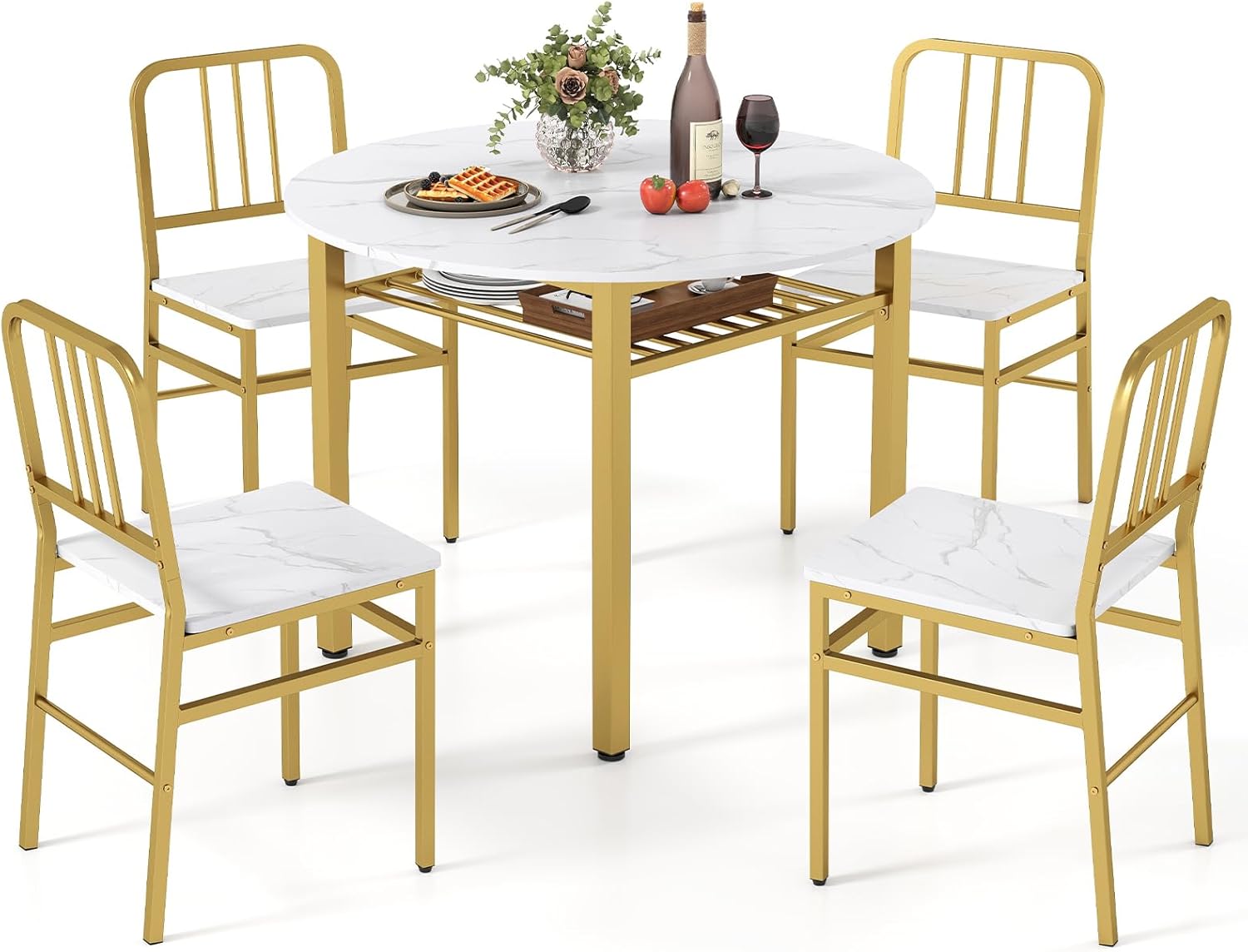 • [Contemporary Style]: With marble grain and gold metal frame, the rectangle dinette furniture set exudes a chic appearance. Also, the backrests with sleek lines add a touch of modern flair, making the dining table set suitable for kitchen, dining room, breakfast nook, or restaurant.
