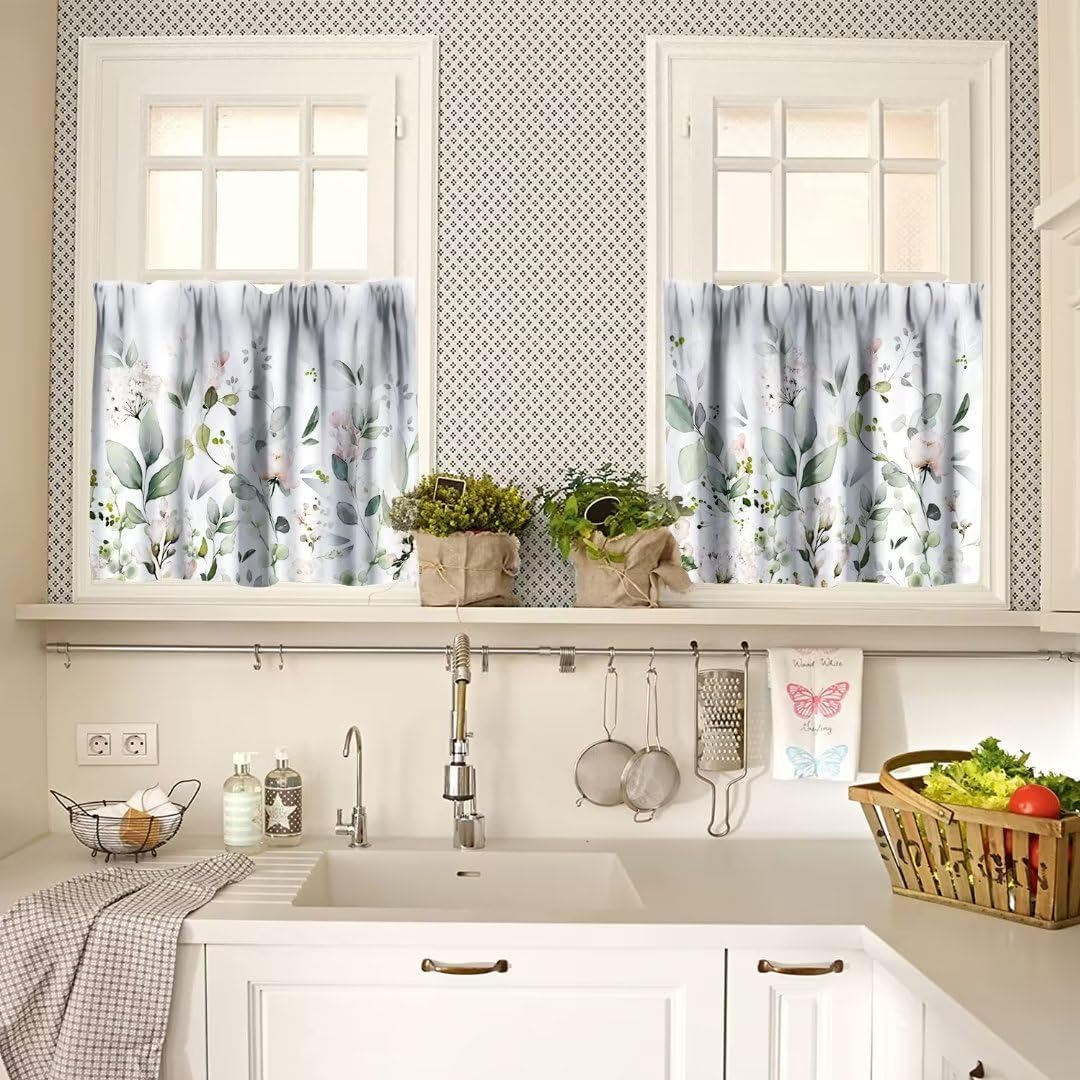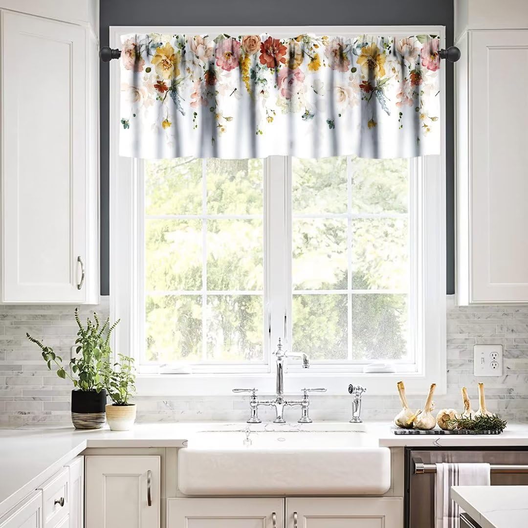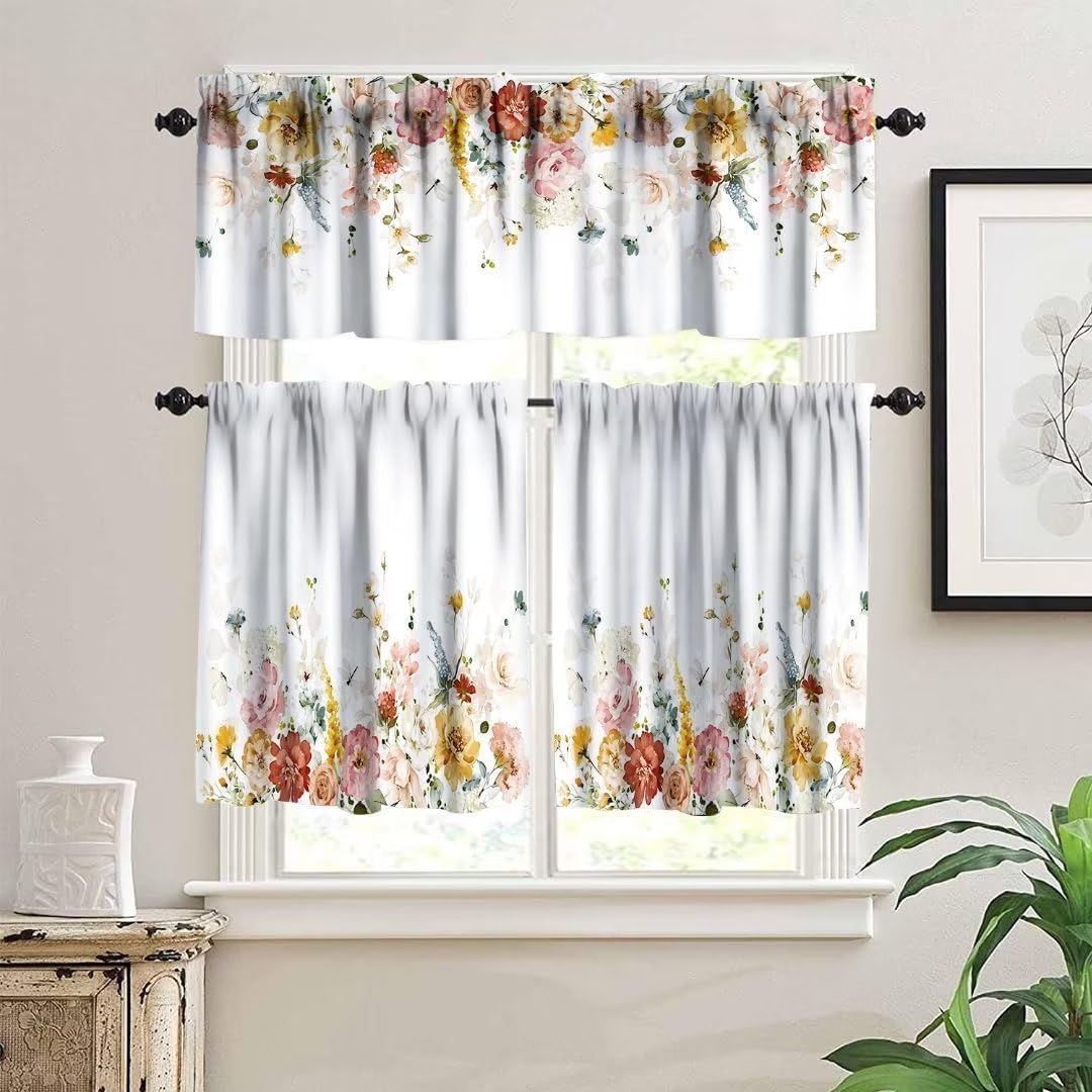 Product details: Material: Polyester Size: 54 inches width x 18 inches length Valance: 54W x 18L Inches, Tier: 27Wx24L Inches per panel, Tier Total: 54Wx24L Hanging: 3 inches long rod pocket for hanging and moving easily Liner or Backing Included: No Easy care: Machine washable in cold water, gentle cycle, tumble dry. Iron at low settings if needed Warm tips: Measure your pole and window size before you choosing. (Diameter of pole less than 1.5 inch)
