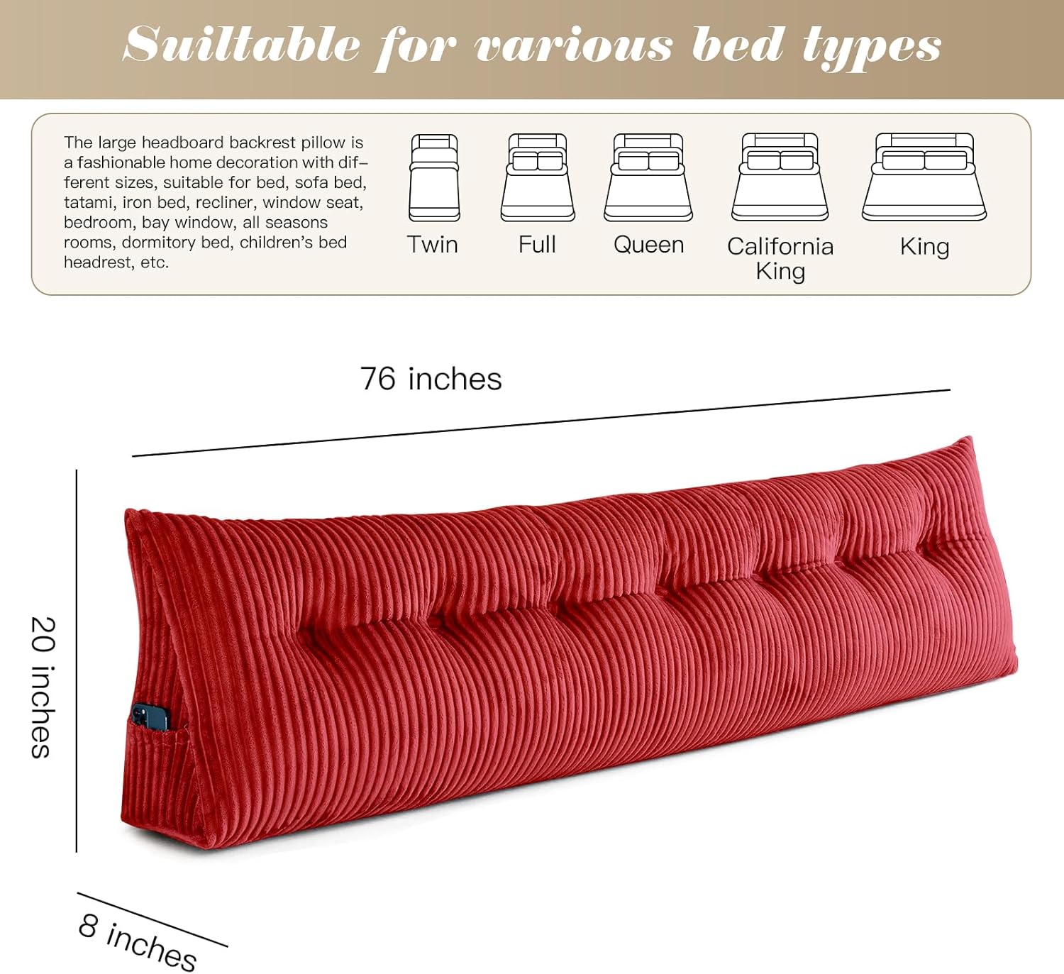 • 【SIZE】 Queen size, 59x8x20 Inches, the large triangular wedge pillow itself aligns with the width of the mattress, alternative as a headboard. ★NOTE: As the backrest is shipped compressed, please remove the vacuum bag, shake vigorously for 5 minutes, and allow 48 hours for the pillow to restore its original fluffy.