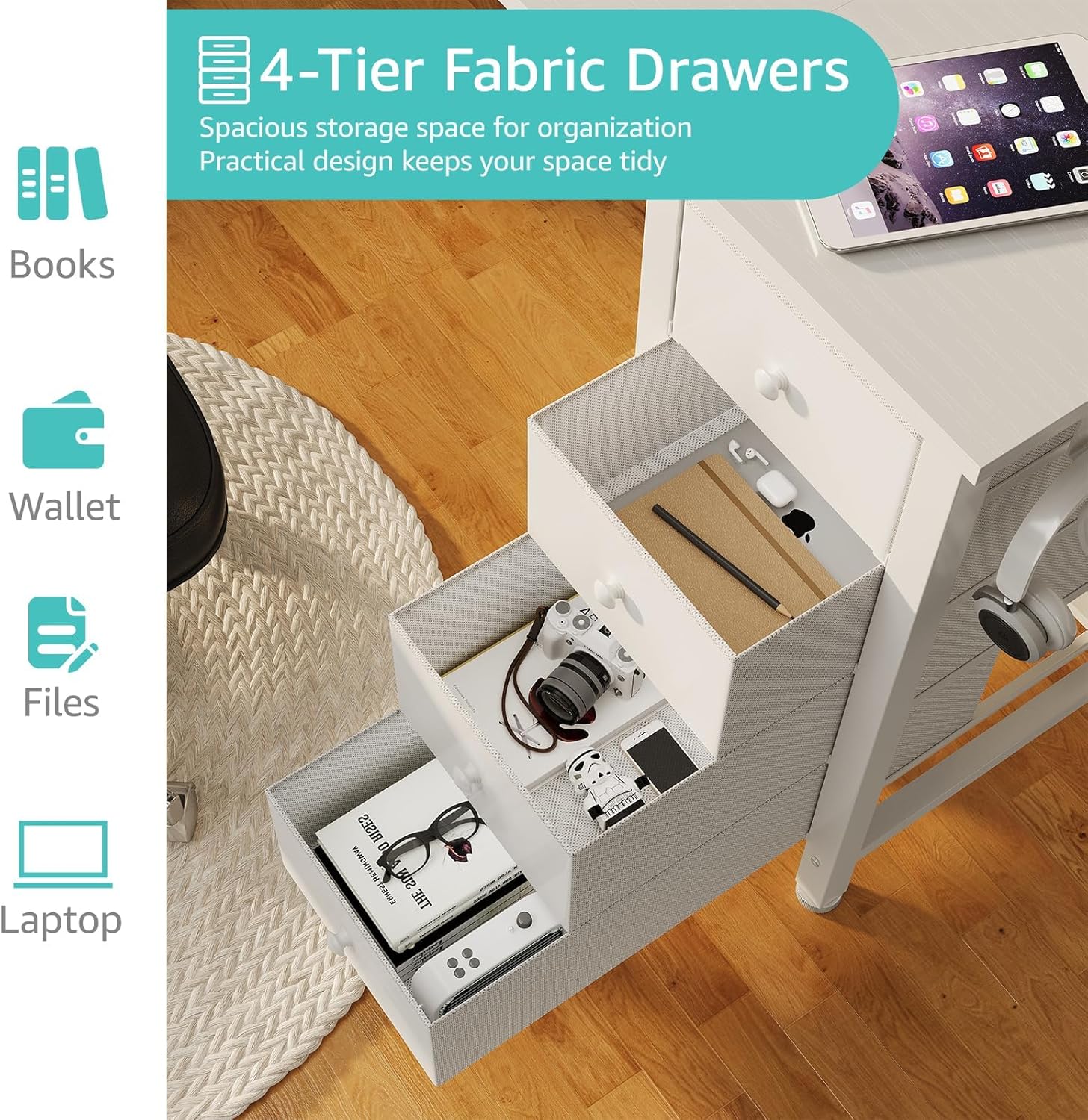 | Storage Options | 4 fabric drawers, 2 shelves |