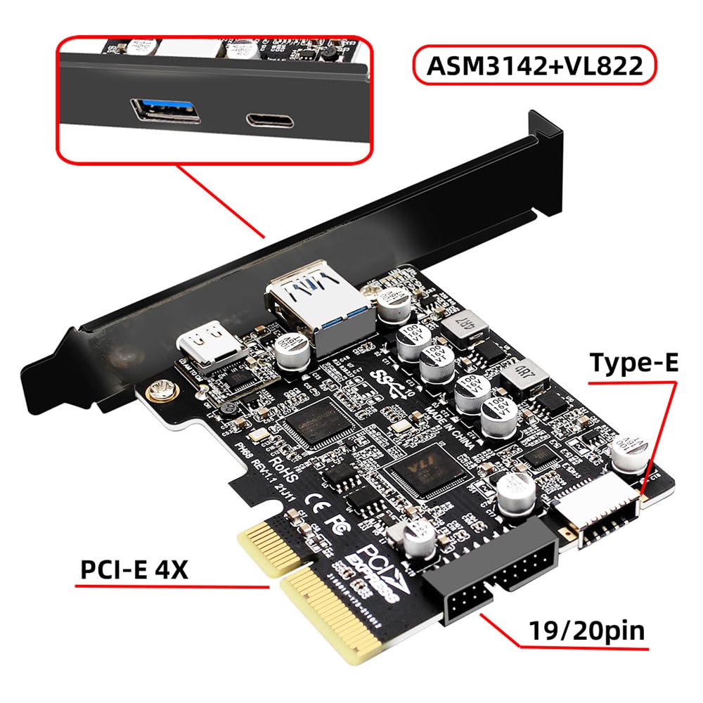 • Three Type-A USB3.0 Back Panel Socket & Dual USB3.1 Type-C USB-C to PCI-E Express Card Adapter ASM3142 VL822