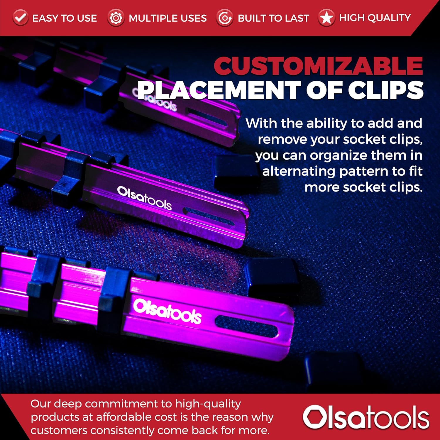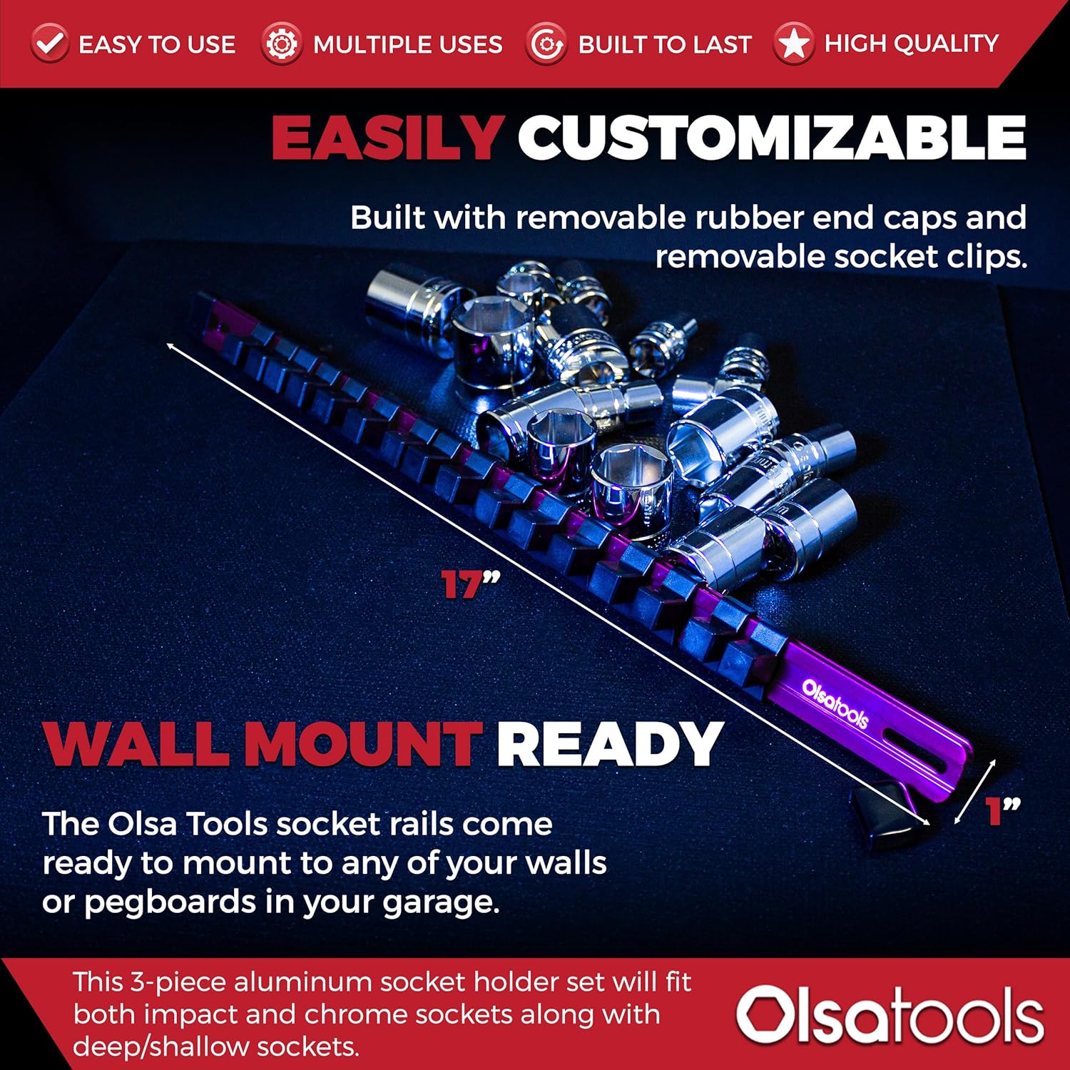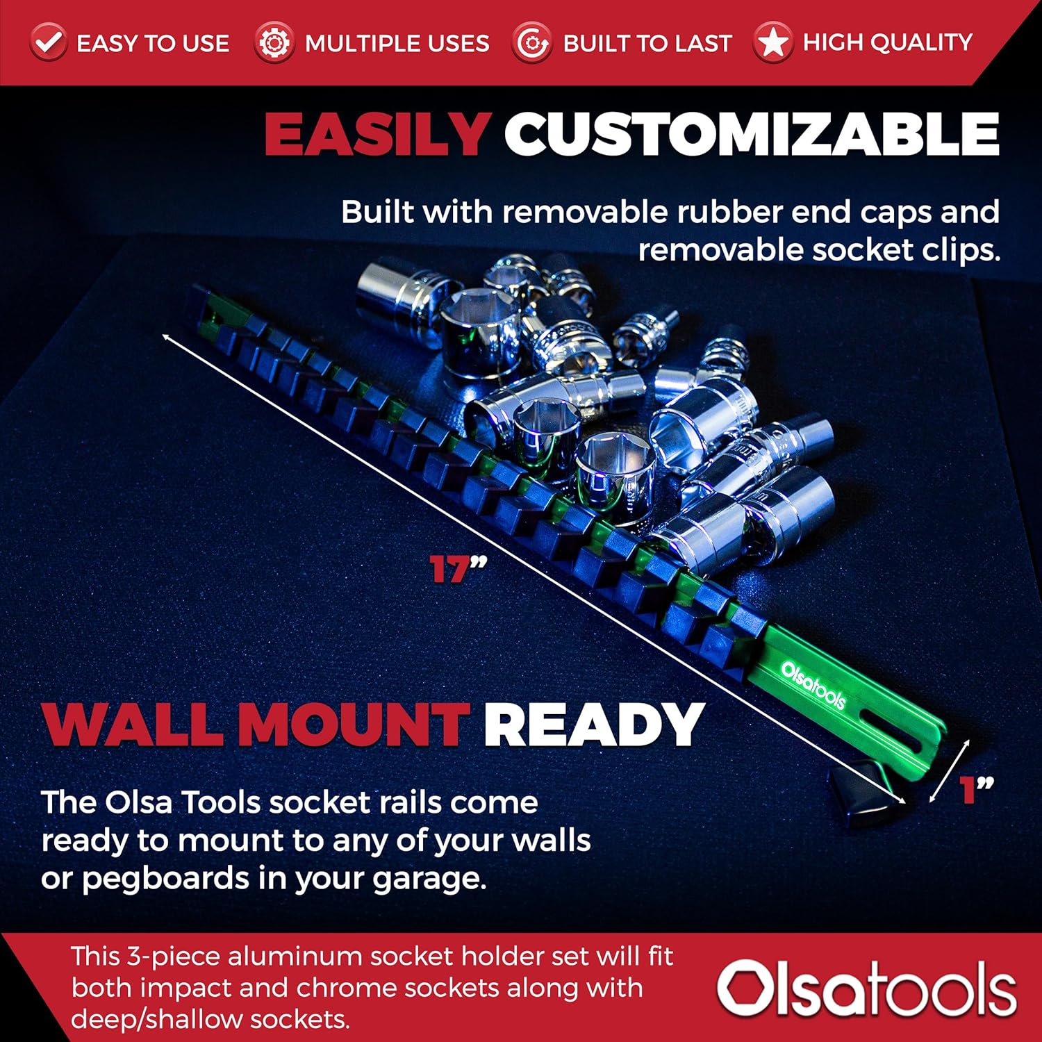 • Heavy Duty - Engineered with high grade anodized aluminum rails and impact resistant ABS clips with steel ball bearings. The Olsa Tools socket organizer is built with durability and long-term use in mind.