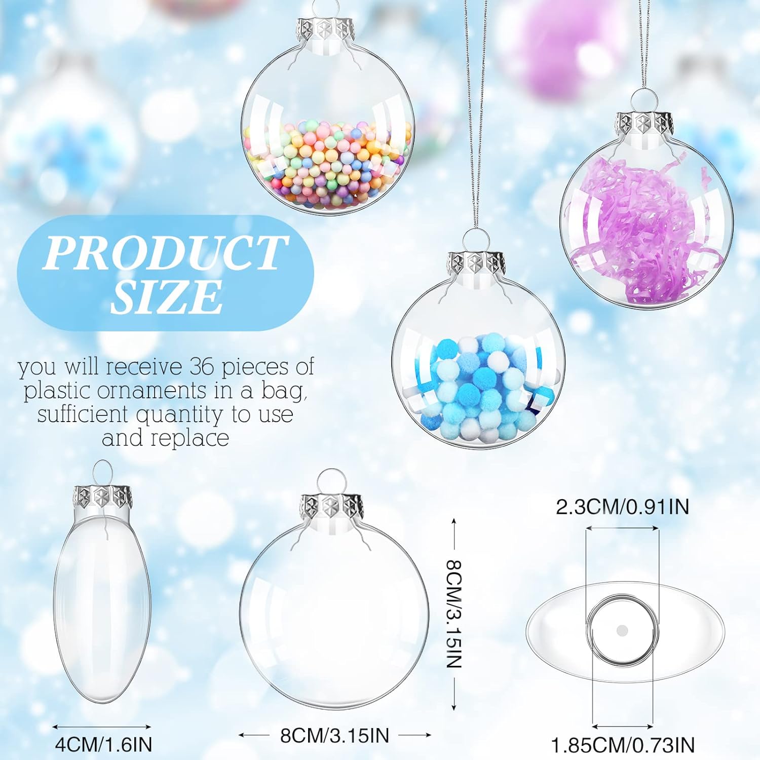 Features: Where to use: Ideal for Christmas party decorations, it comes with a ribbon loop for easily hanging on the Christmas tree or any other place where you can hang to display it in your home throughout the year. Safe and sturdy: These Christmas tree hanging ornaments are made of PET and aluminum material, lightweight and beautiful, clear in appearance, safe and non toxic, will serve you long time. Specifications: Material: PET and aluminum Color: white Size: 3.15 x 3.15 inches Package: box Package contents: 60 x Christmas ornaments Warm notice: Since the size above is measured by hand, the size of the actual item you received could be slight different from the size above. Due to the different monitor and light effect, the actual color may be a little different from the picture's.