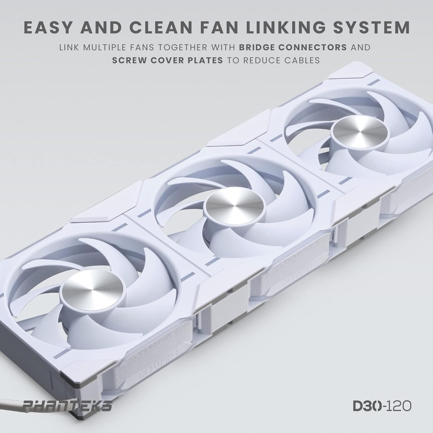 The Phanteks D30-120 comes equipped with integrated D-RGB lighting throughout its frame and blades on all sides. Multiple D30-120 fan frames can be linked together as one with bridge connectors and screw cover plates to reduce cables, resulting in extremely clean builds. The D30-120 combines premium D-RGB lighting with 30 mm thick and aerodynamic fan blades inspired by the ultimate T30 fan, which makes it a true premium D-RGB fan for modern systems. The D30-120 comes in two airflow direction models, regular and reversed. This unique option allows for the ultimate fan configuration for any system. Type:Case Fan. Wind Direction:Regular. Color:White Matte blade/Black Fan Frame. Materials:PBT (Polybutylene terephthalate). Fan Size:120 x 120 x 30 mm. Bearing Type:FDB (Fluid Dynamic Bearing). Blade Geometry:Seven Blades Design- White Matte. Rated Voltage:FAN: 12V LED: 5V. Operating Voltage Range:5~13.2V. PWM:Yes. Rated Current (Ampere):0.15A LED:0.45A(Max). Locked Current:Polarity Protection. Power Consumption: less or equal 1.8W. Speed:250-2000 plus-minus 10% RPM. Max. Airflow:64.3 CFM. Max. Air Pressure:3.01 mm H2O. Noise Level:30.2 dB(A). Fan Connector:4-Pin PWN. Fan Cable Length:700 mm / 27.56 in. D-RGB Connector:3-Pin JST Daisy-chain. D-RGB Cable Length:600+100 mm / 23.62+3.94 in. LED Number:32 (D-RGB). LED Rated Voltage DC:5V (+5V/D/GND). LED Rated Current Max:0.45A. MTBF (Life Expectance):50,000hrs at 40 degree Celsius.