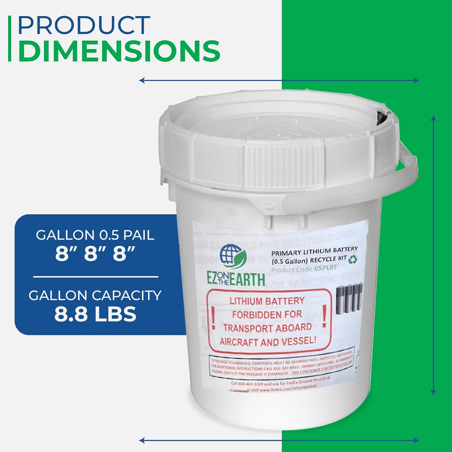 About EZ On The Earth 1 Gallon For Lithium Batteries: Designed for Various Battery Types: Our kit is meticulously crafted to properly recycle a range of Rechargeable Lithium-ion and Non-Rechargeable Primary Lithium Batteries. This includes Lithium-Sulfur Dioxide (LiSO2), Lithium Manganese Dioxide (LiMnO2), and Lithium Thionyl Chloride (LiSOCI2). What will be shipped to the Customer: 1) The cardboard Box that will have the insulated container (pail). 2) The Insulated Plastic Container (Pail) where the customer will place the batteries. 3)Electrical Tape and Baggies to Insulate Batteries. 4) Heavy Plastic Liner. 5) Zip tie to seal the Plastic Liner. 6) A pre-paid Return shipping label to ship the Cardboard Box for Recycling the Batteries. 7) A guide on How to obtain the Certificate of Recycling Online & how to track the container. . Stay Mindful of Our Guidelines: - All terminals must be insulated using clear, non-conductive tape. This crucial step ensures safe handling and transport. - Important: Avoid including wet cell batteries, lead acid batteries, lithium batteries exceeding 5 grams of lithium per cell or 25 grams in total, as well as broken/cracked/damaged batteries in the kit. As the wise saying goes, "The greatest threat to our planet is the belief that someone else will save it." With the EZ On The Earth, you take the reins of environmental responsibility, contributing to a cleaner and healthier world one battery at a time.