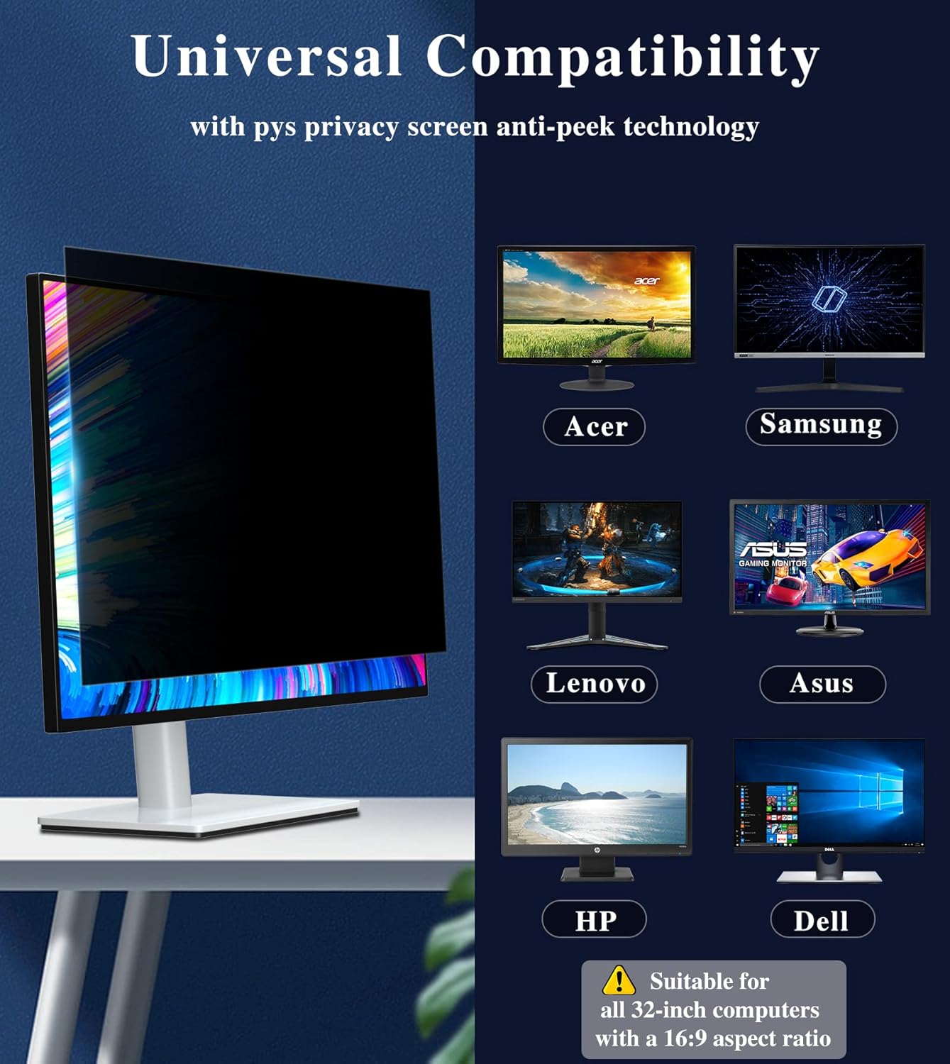 • [Privacy Filter Dimensions] - Width: 23 9/16" (598 mm), Height: 13 1/4" (337 mm), Diagonal: 27" (685.8 mm) - PYS Privacy Screen Filter is engineered to be compatible with HP, Dell, Samsung, Lenovo, LG, Acer, ASUS, ViewSonic, and other monitor brands. Please measure your laptop size before ordering a privacy screen. If you are not sure about your size, you can consult us.