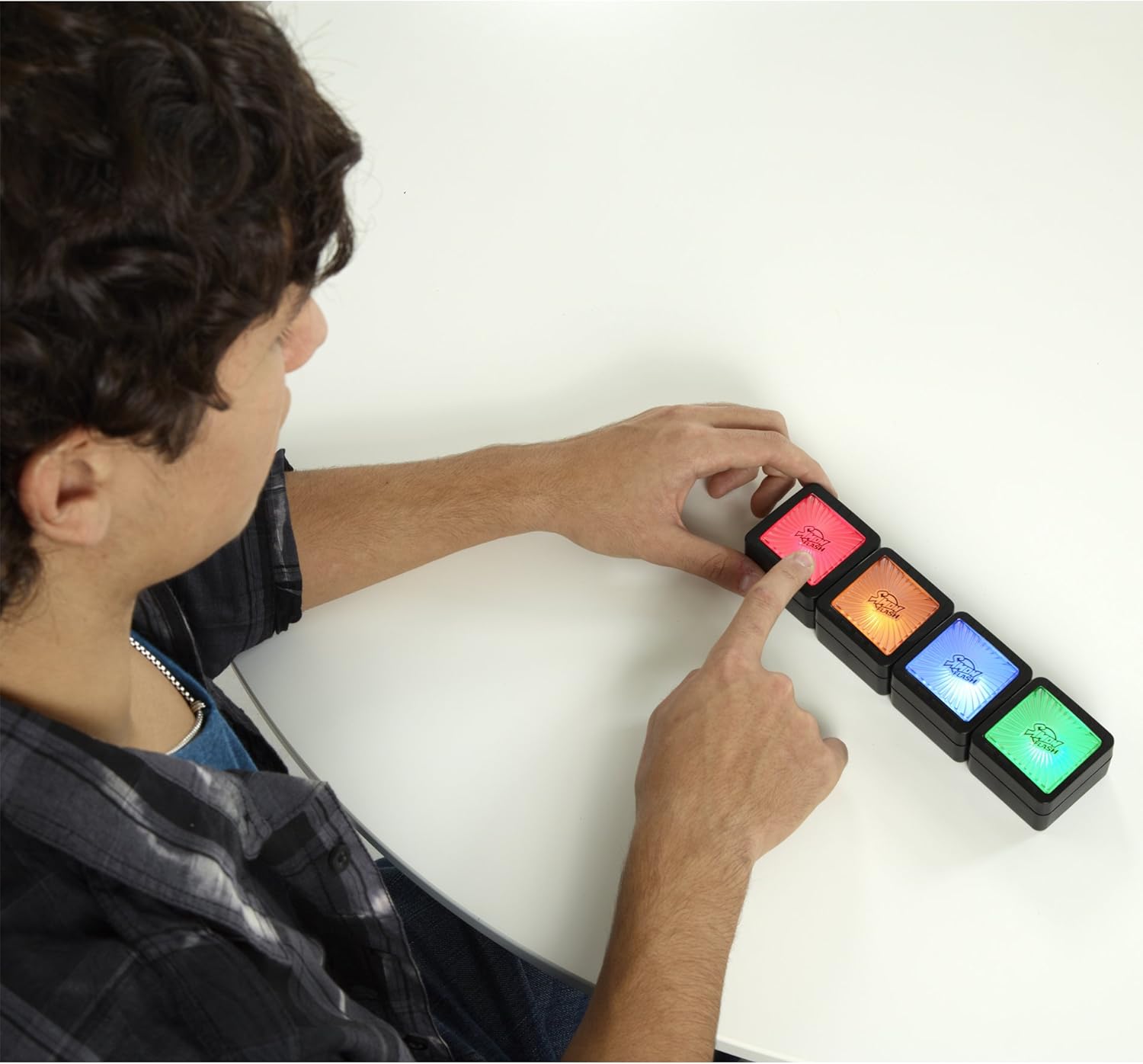 Product Description Combining the smash hit game of the 80's, Simon, with the magic, fast, frantic and intuitive play of Flash. There are four exciting games to play solo or socially. Amazon.com SIMON Flash Ages: Eight years and upRequires: Eight AAA batteries (included) At a Glance: High-tech twist on legendary Simon game tests memory, speed, and logic skillsContains four games in onePortable carrying case for on-the-go playAutomatically shuts off when not in useUtilizes Wonder-Link technology, bright lights, colors, and sounds Challenge your friends or tune up your skills on your own. View larger. Four SIMON games in one! View larger. Featuring four brainteaser games to challenge your child's memory, speed, and logic, Hasbro's Simon Flash is a high-tech twist on the legendary Simon game. Four electronic cubes utilize light, sound, and changing colors to keep your child having fun and learning new skills during each game. Revolutionary Wonder-Link technology allows each cube to know where you've placed it, when you win a round, and keeps track of the score.Four Games in OneRanging from 90 seconds to more than two minutes, Simon Flash contains four quick-fire games in one package: Simon Lights Off, Simon Shuffle, Simon Secret Color, and Simon Classic. Each game is associated with a colored cube (red, yellow, blue, or green) and can be started by pressing the cube that bears that color. Each game stimulates learning through challenging the player's memory, speed, and logic.With Simon Shuffle, you solve each puzzle by lining up the colors in the original order displayed. In Simon Lights Off, you have to solve each puzzle by lining up the cubes in the correct order so that all the lights turn off. In Simon Secret Color, you solve the puzzle by figuring out the order to place the cubes in. As you get them in the right place, each cube turns to show the same color. The fourth game, Simon Classic, is the classic Simon game where you correctly repeat an increasing sequence of colors.Carrying Case, Easy On/Off and Mute OptionsThe cubes come with a portable carrying case for on-the-go play, ideal for a car trip with the family. A quick-play card lets you begin any game with minimal instruction. Easily mute sound, turn off cubes, or switch to a different game with the press of a button. For added convenience, the cubes automatically power down after three minutes of nonuse to save battery life.While Simon Flash is recommended for children eight and older, our testers found that some games are appropriate for younger children, and that some games were more challenging than others. In addition, the scoring system, comprised of cubes flashing multiple times to indicate points won, can be confusing.Note: although the game indicates it can be played competitively with others, most games cannot be played simultaneously by two players. Competition between players requires each player to take a turn and then compare scores.What's in the BoxFour electronic cubes, game case, rules, eight AAA batteries, and quick-play card. P.when('A').execute(function(A) { A.on('a:expander:toggle_description:toggle:collapse', function(data) { window.scroll(0, data.expander.$expander[0].offsetTop-100); }); }); From the Manufacturer It’s four Simon games in one. The Wonder-Link technology lets the cubes know where you shuffle them, when you win and what you scored. The yellow game is Simon Lights Off. Can you quickly line up the cubes in just the right order to turn off all the lights? The red game is Simon Shuffle. When the cube colors scramble, can you line them up in their original order? The blue game is Simon Secret Color, there’s only one order that will show the same color on all four cubes. How fast can you unlock the code? The green game is Simon Classic Stop shuffling. Start pressing. Can you remember and repeat a longer and longer sequence of colors? Challenge your friends or tune up your skills on your own. High-tech twist on the legendary Simon game tests your memory and logic skills to the max. Includes 4 electronic cubes, game case, rules and quick-play card. See more