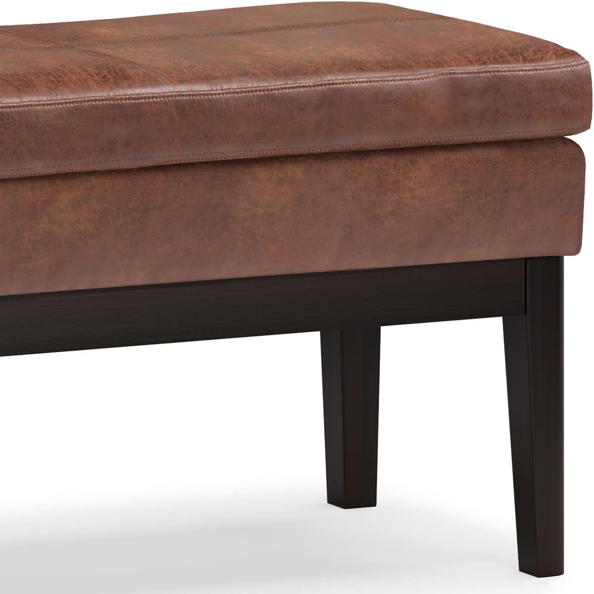 • VERSATILE DESIGN: Handcrafted small ottoman bench with solid pine wood frame and dark walnut-finished legs; upholstered in distressed saddle brown vegan faux leather for a rustic, vintage-inspired look