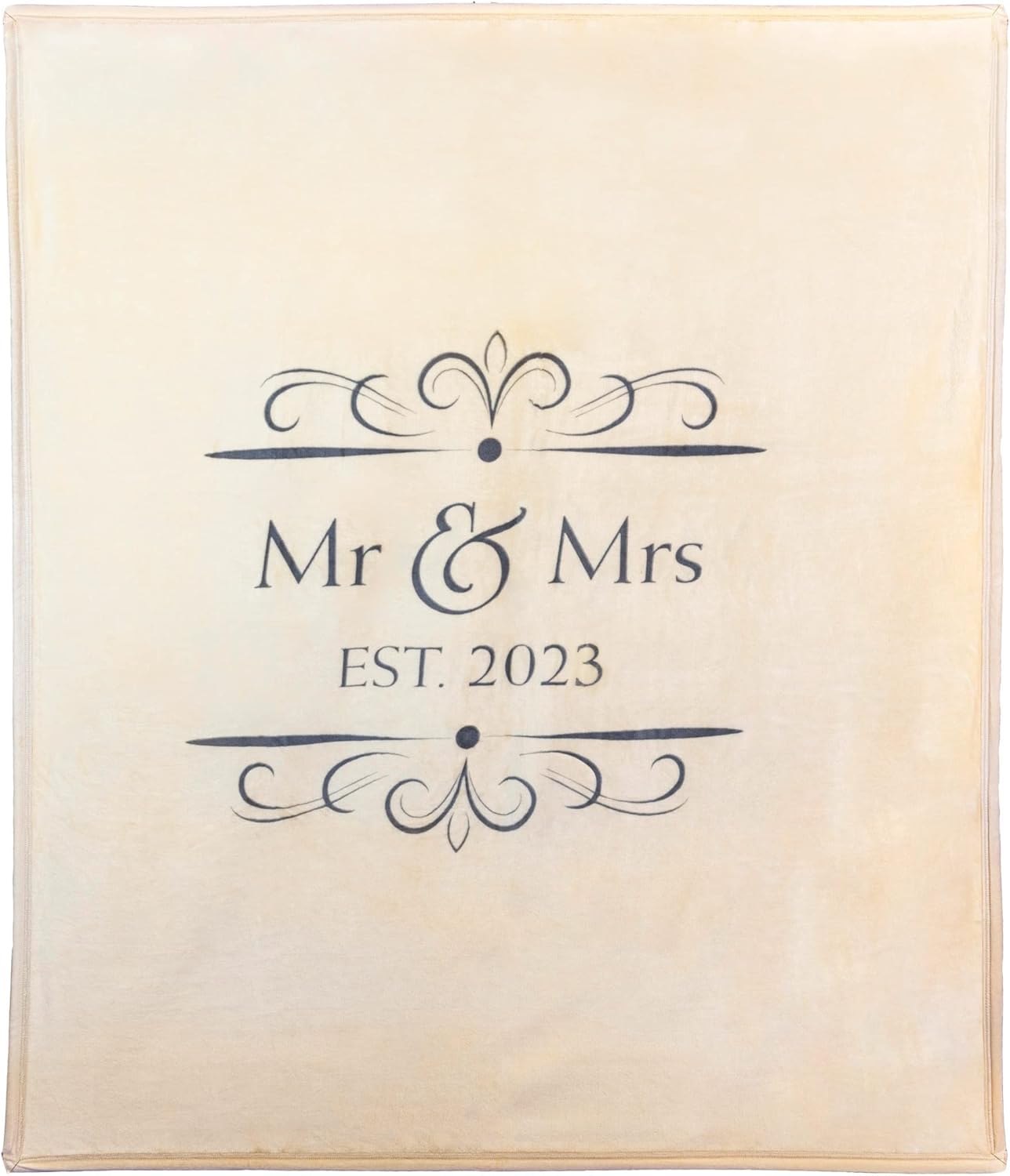 Are you on the hunt for unique custom gifts that go beyond the registry for special occasions like bridal showers, weddings, or wedding anniversaries? Look no further! Our personalized throw blanket is the perfect choice. Whether it's for a bridal shower, a newly married couple, or a couple celebrating their wedding anniversary, this versatile and incredibly soft throw blanket is a thoughtful and cherished gift. Its neutral design featuring the words "Mr. & Mrs." along with the year "Est. 2025" ensures it matches seamlessly with any decor. This luxurious blanket is tailor-made for cozy moments. Whether you're snuggling up on the couch, adding a touch of style to your living space, or staying warm during chilly outdoor evenings, this throw blanket has got you covered. Crafted from 100% polyester, it's not only incredibly soft but also machine-washable, ensuring both lasting quality and easy care. Say goodbye to the hassle of dealing with shedding blankets. Couples adore custom Mr. and Mrs. gifts, and this personalized blanket will become a cherished keepsake they'll use and love for years to come. Don't settle for the ordinary; surprise your friends on their engagement, celebrate a newly married couple, or delight your spouse with this exceptional gift. It's the perfect blanket for any couple's journey together.