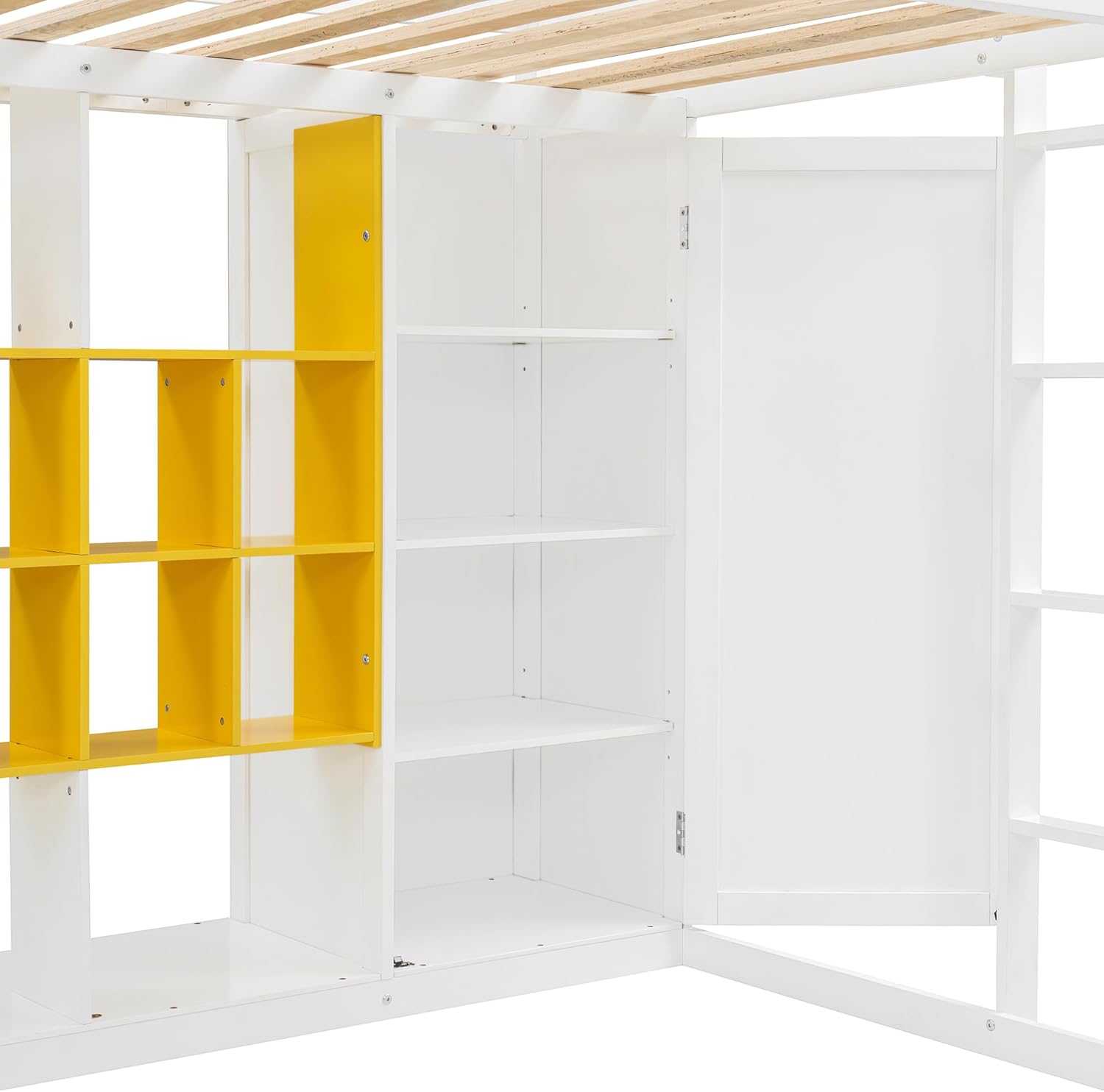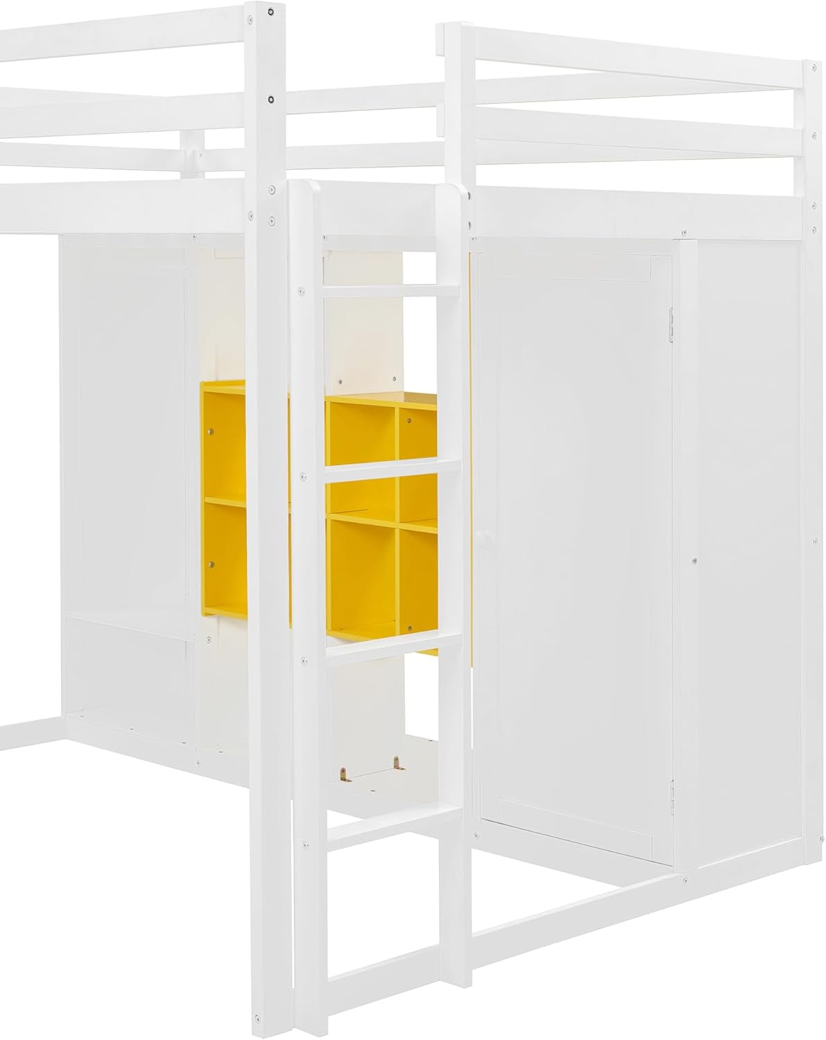 ❤ Maximize your space with this stylish and functional wooden loft bed, perfect for modern bedrooms with limited square footage. Designed with both safety and storage in mind, it features full-length guardrails and sturdy slats for reliable mattress support. The bed includes a vibrant multi-layer shelving system, a sleek open wardrobe, and a closed cabinet—offering ample storage for clothes, books, and essentials. The colorful shelving adds a bold pop of personality while blending harmoniously with the bed’s elegant wood finish. With a reversible staircase that can be installed on either side, this loft bed adapts easily to your room layout and daily habits.◾ Weight & Dimensions:Product Type: Loft BedProduct Material: Plywood+MDF+PinewoodOverall Product Dimension: 78.3"L x 42.4"W x 65"HOverall Product Weight: 192.69lbsWeight Capacity: 400LBSThe Number of Slats: 14Recommended Mattress Thickness: 4-6"Box Spring Required: NoMattress Included: NoIs installation required: YesRecommended Age: Over 6 yearsCountry of Origin: Vietnam◾ Notes:1. Manual measurement has been used,there may be some reasonable error.2. All the pictures are taken by actual samples, slight chromatic aberration may occur due to lighting or display.