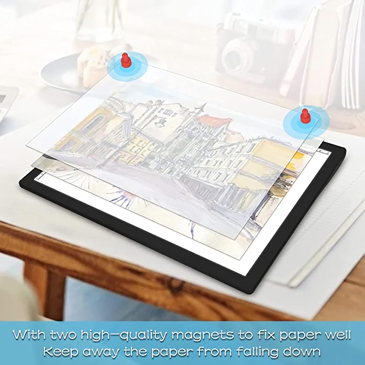 Description:This ultra-thin and lightweight LED tracing board combines style with practical features. With advanced eyesight protected technology, it is great to create artwork for a long time.HIGH BRIGHTNESS WITH LESS HEAT:This LED tracing light box is characterized by high photosynthetic efficiency and high illuminance but it gives out very little heat, therefore, it is a product of high brightness and low-power consumption. With 50000 hours of service life, it can last for a long-term working period.Precision Ruler DesignDesigned with the rulers on the left edge and top of the acrylic surface, it will help you to precise draw.EASY TO USE WITH ADJUSTABLE ILLUMINANCE:As the brightness is adjustable and stepless, it can be adjusted from 0 % to 100 %. What’s more, it is way easy to use and all you need to do is to turn on the simple touch button on the drawing board and then start to unlock your potential and have fun.All drawing boards are 0.8 cm thickA1, A2 voltage: 12V low voltage, in-line power supplyA3, A4 voltage: 5V, USB interface or USB plugPackage included:1X LED Light Pad1X power cable1X User’s Manual4 × Magnet1× Ink spacerBefore using this device, please remove the protective film from the surface of the board. The film is there to protect it during shipping but leaving the film on the board may damage it over time and will make it more difficult to use..